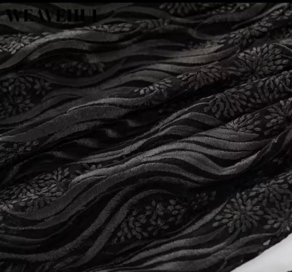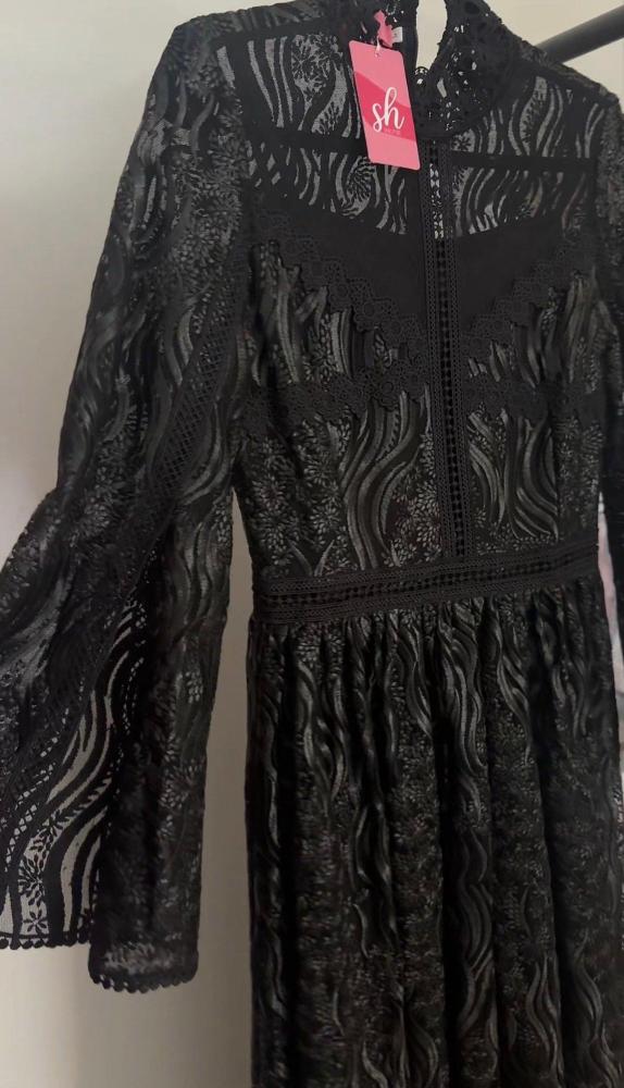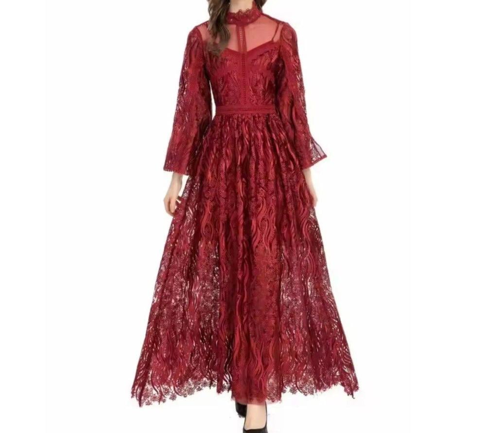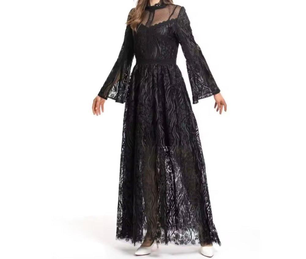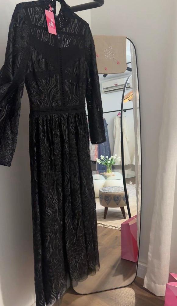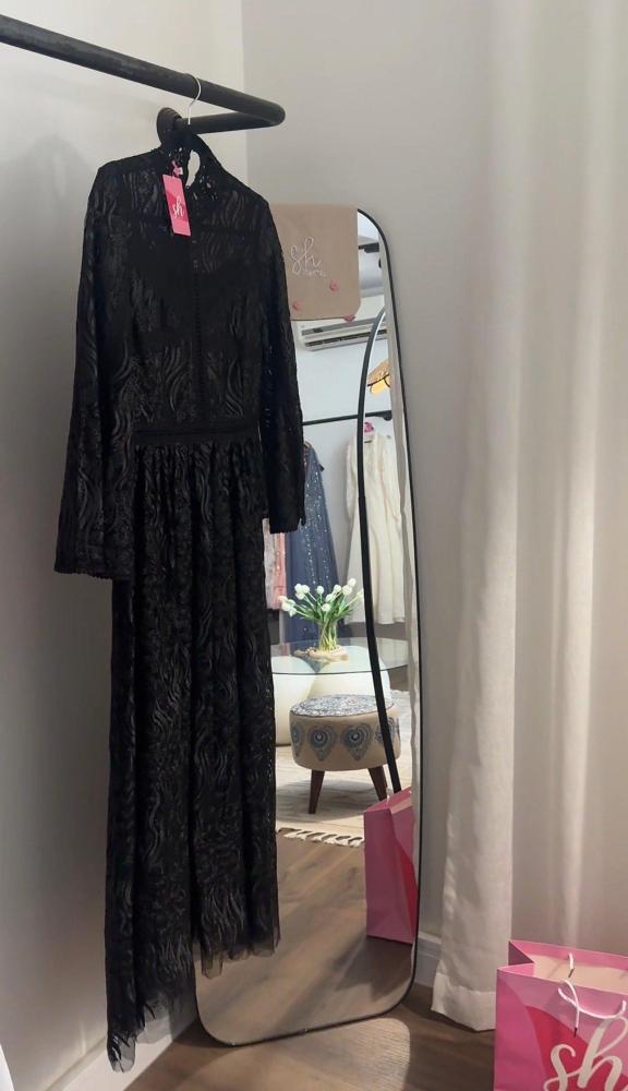 فستان: طويل مصنوع من قماش الدانتيل الفاخر، يتميز بتطريزات غنية وتصميم أنيق يعكس الفخامة.