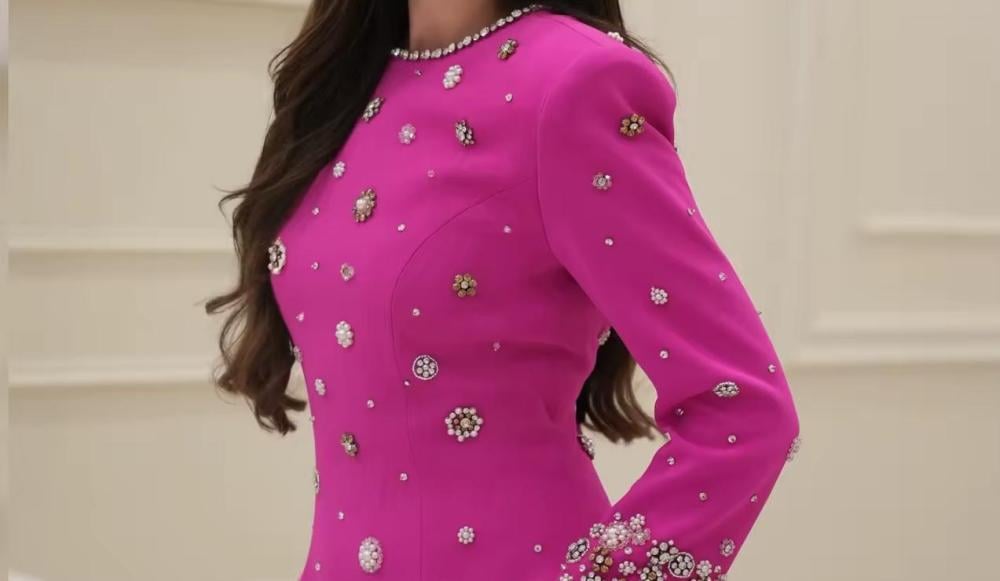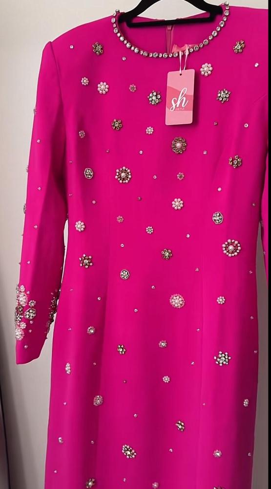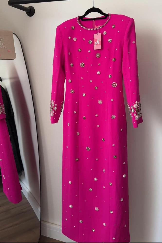 فستان:طويل أنيق مصنوع من قماش ناعم مطرز كرستال ، يتميز بتطريزات لامعة موزعة بشكل متوازن تضيف لمسة فخامة راقية.