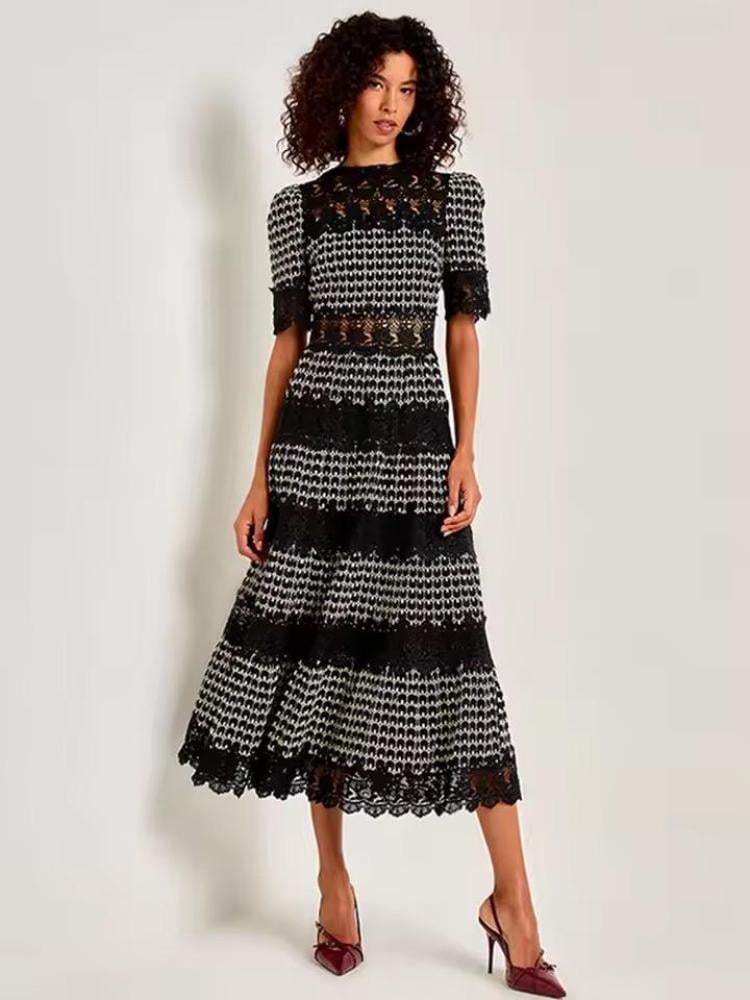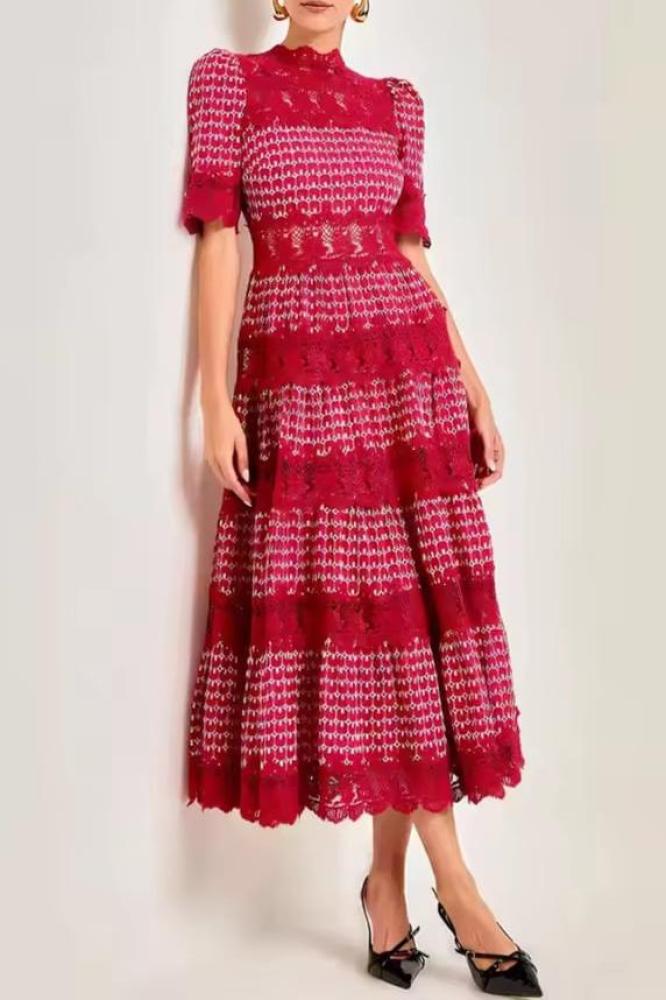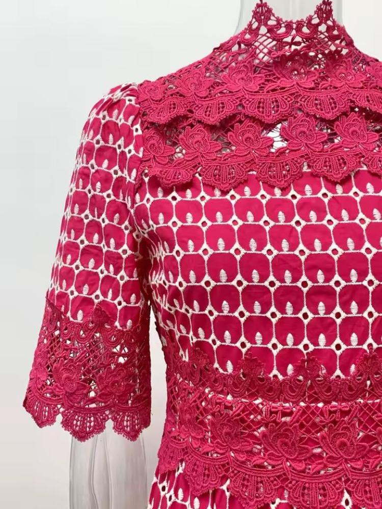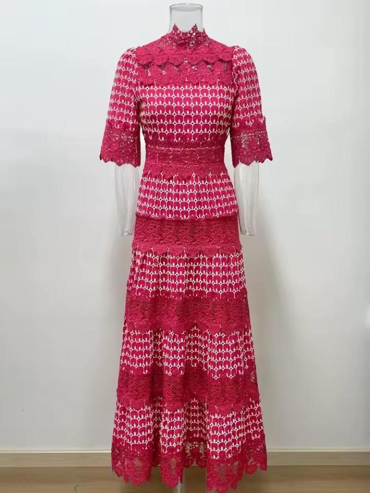 فستان: طويل مصنوع من الدانتيل المخرّم بتصميم أنثوي جذاب.
