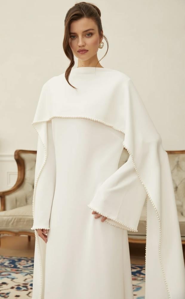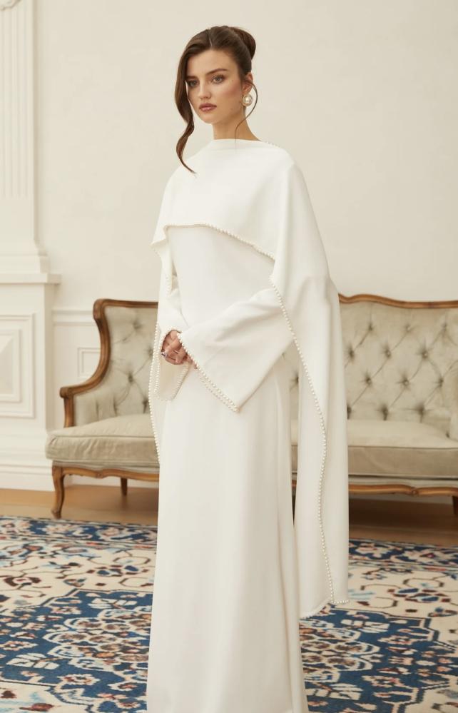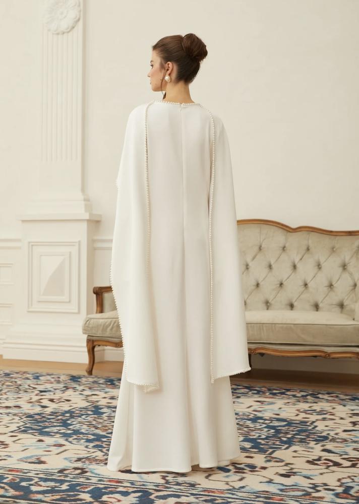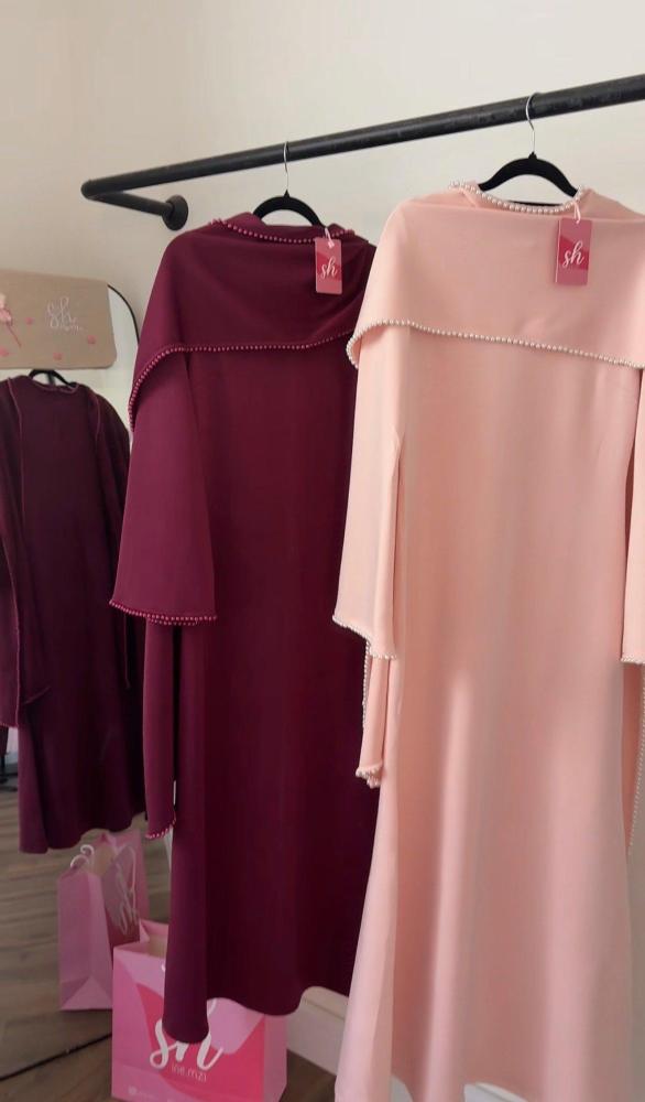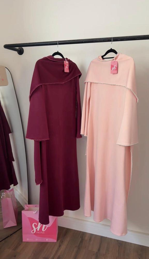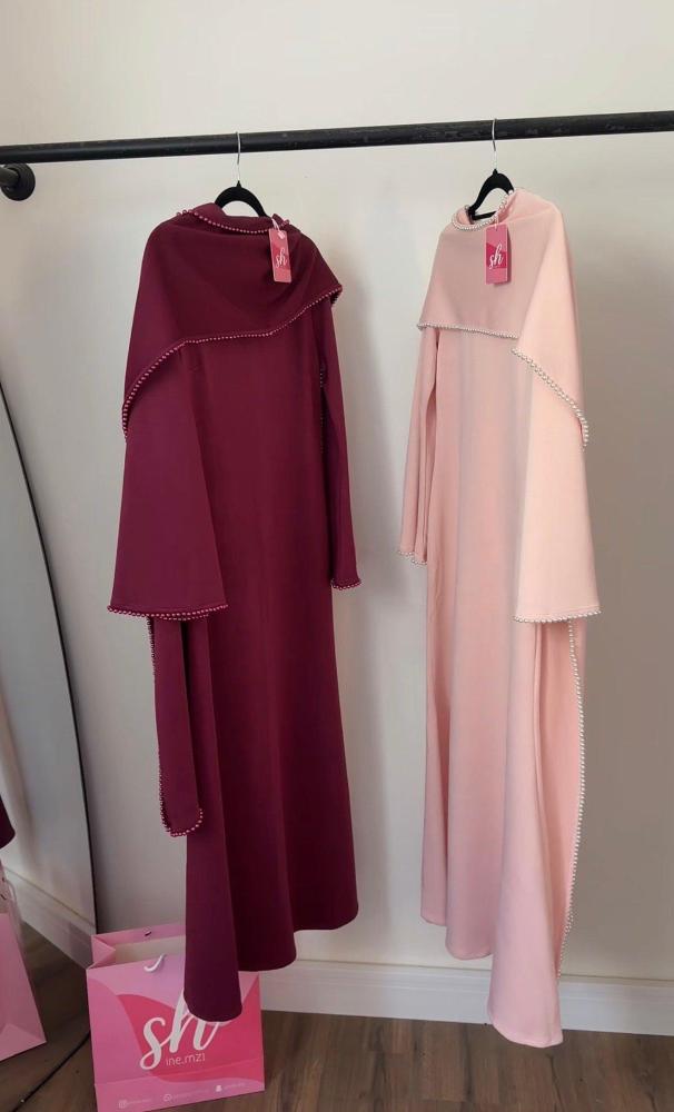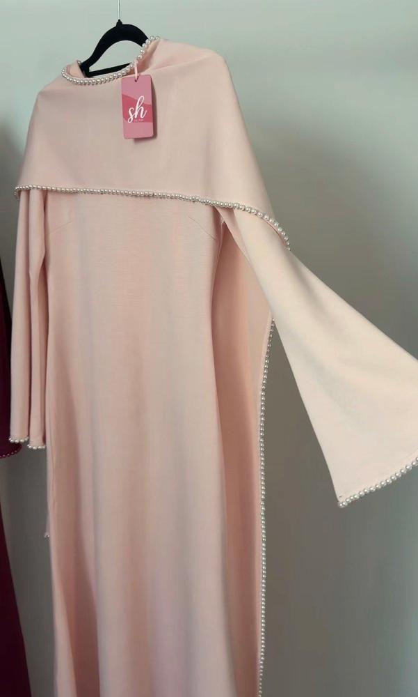 فستان: أنيق بقصة مستقيمة وناعمة، يتميّز بأكمام طويلة مع شال متصل ينسدل بانسيابية، وأطرافه مزينة بحبات لؤلؤ تمنح إطلالة راقية وفخمة ✨🌸