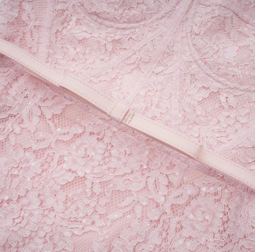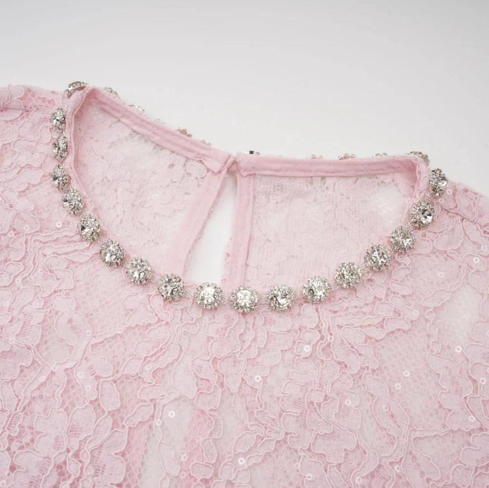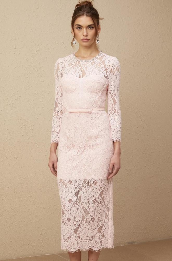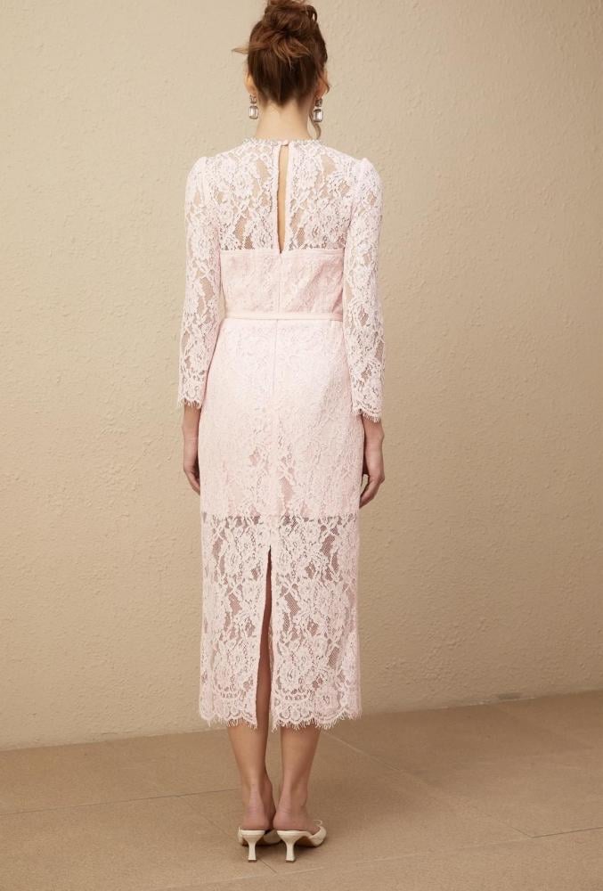 فستان دانتيل ناعم بلون وردي فاتح، يتميز بتصميم أنثوي راقٍ وقصة مستقيمة تبرز القوام بذوق هادئ.