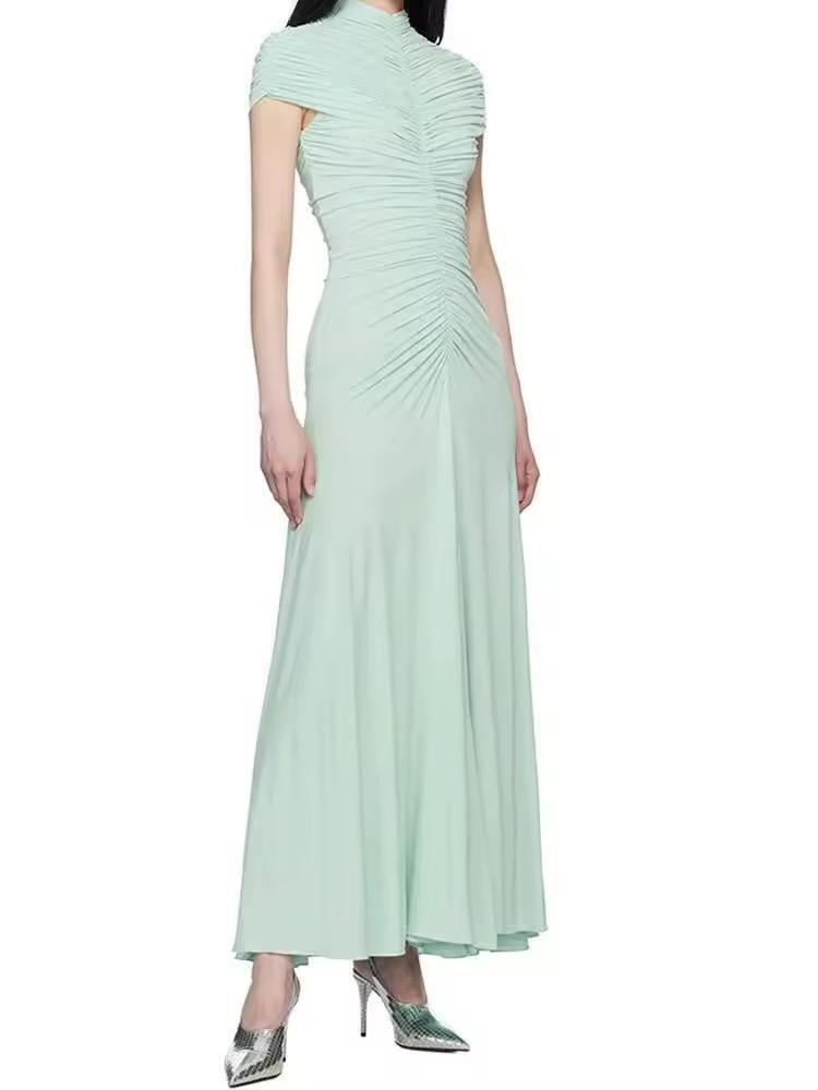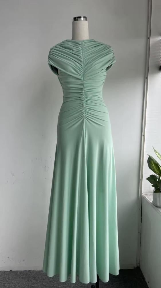 فستان سهرة أنيق بلون أخضر بارد، بتصميم كسرات طولية تمنح إطلالة راقية وتزيد من الانسيابية، خامة مريحة وقصة تبرز جمال القوام بأسلوب ناعم وفخم.