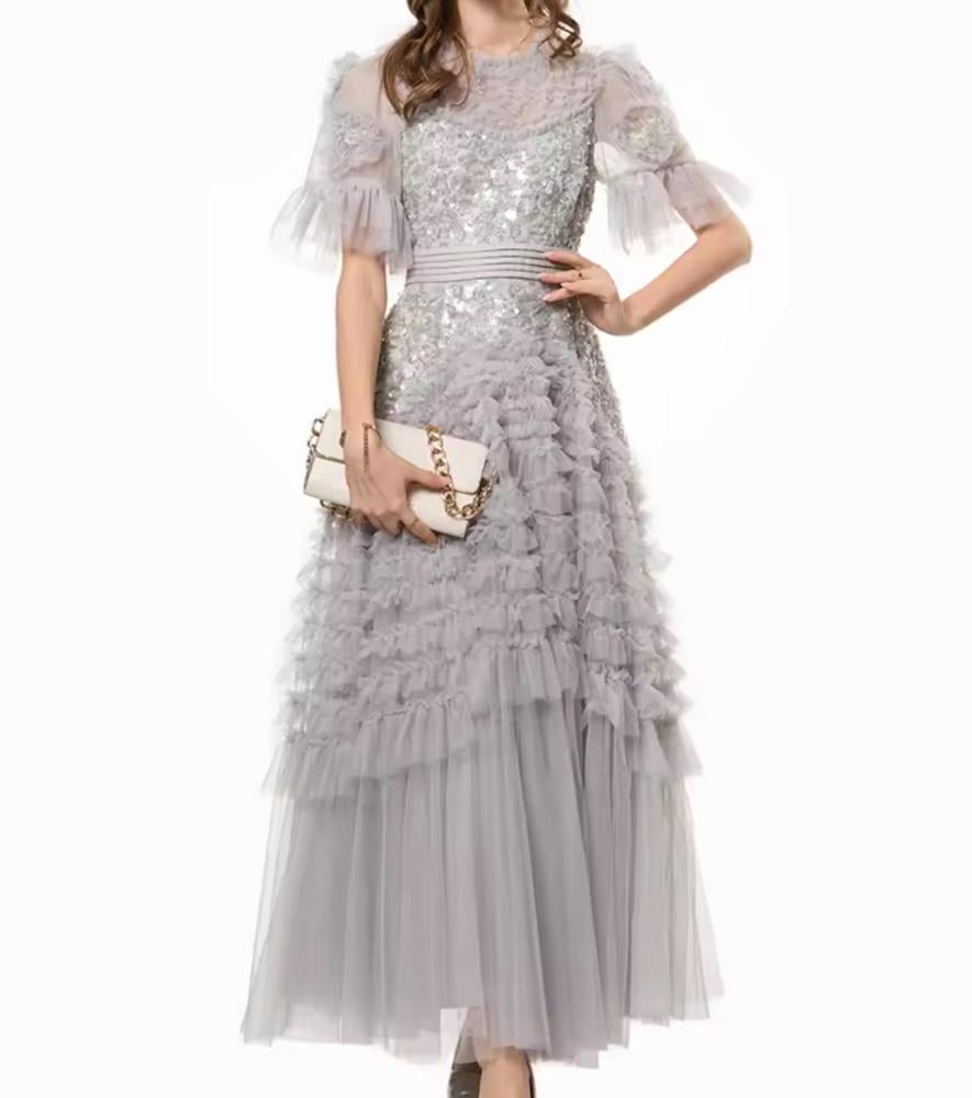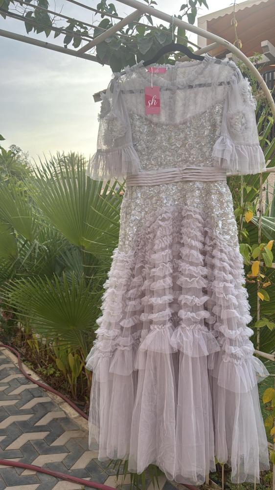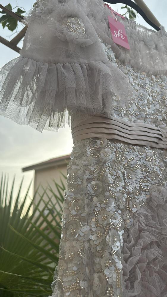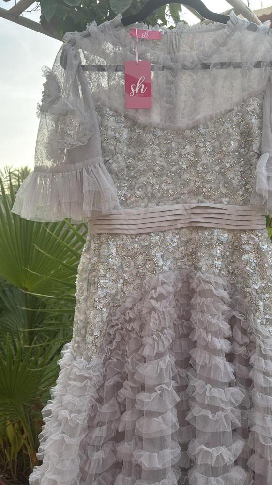 فستان: فخم بطبقات من الشيفون المطرز مع تفاصيل كشكش ناعمة، مثالي للمناسبات والسهرات الراقية 🤍✨