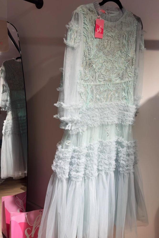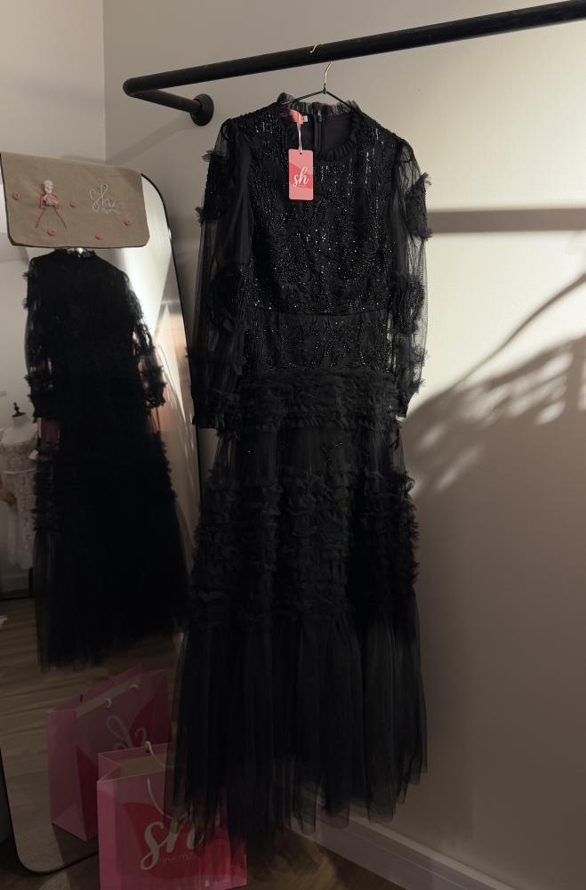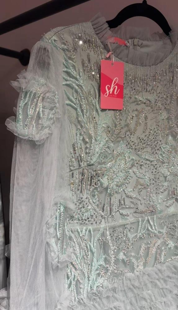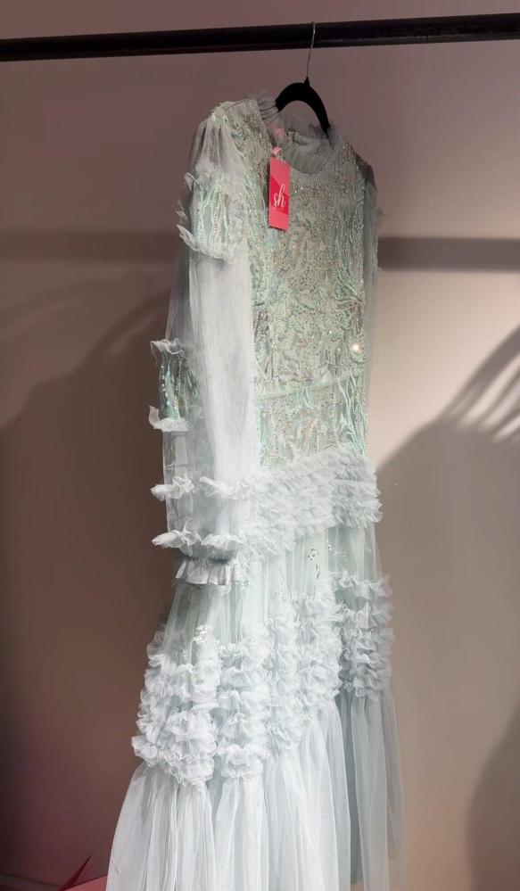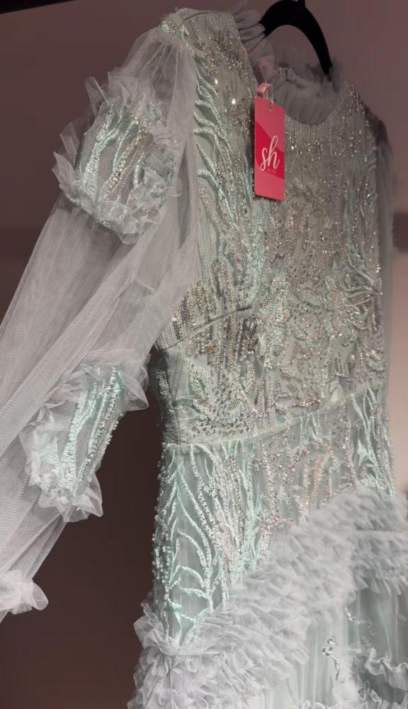 فستان: عصري بتصميم فخم وأكمام شفافة، يجمع بين الأناقة والجرأة لإطلالة لافتة في السهرات✨